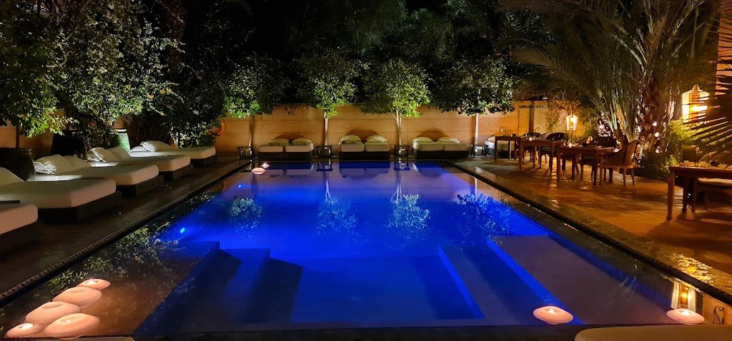 À Marrakech, Dar Rhizlane – Palais, table d’hôtes & Spa offre une parenthèse hors du temps : jardin luxuriant, calme absolu et ambiance feutrée, presque romantique le soir quand les lumières se posent sur la verdure. Même sans y séjourner, le restaurant accueille et installe dans un décor digne d’un conte.