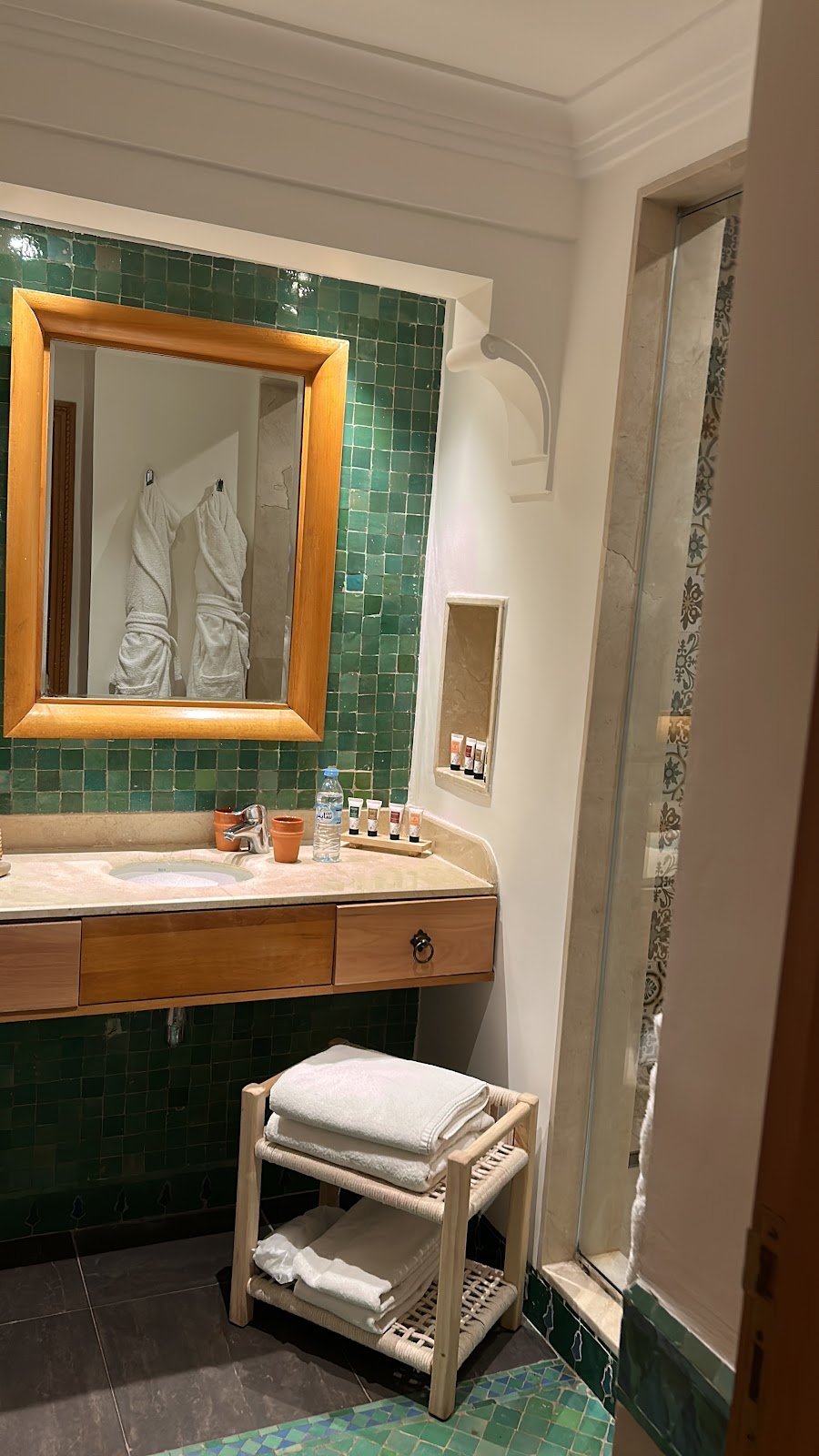 Agréable Séjour passé dans ce bel hôtel luxueux Tout le personnel est bienveillant et est au service des clients. Restaurant de bonne qualité avec spécialité marocaine et italienne. Proche de l'aéroport ( pratique mais légèrement bruyant) et 35 min a pieds de la place jemaa el fna NB attention avec la compagnie royal air maroc avec escale qui ne fait pas suivre les bagages en soute...